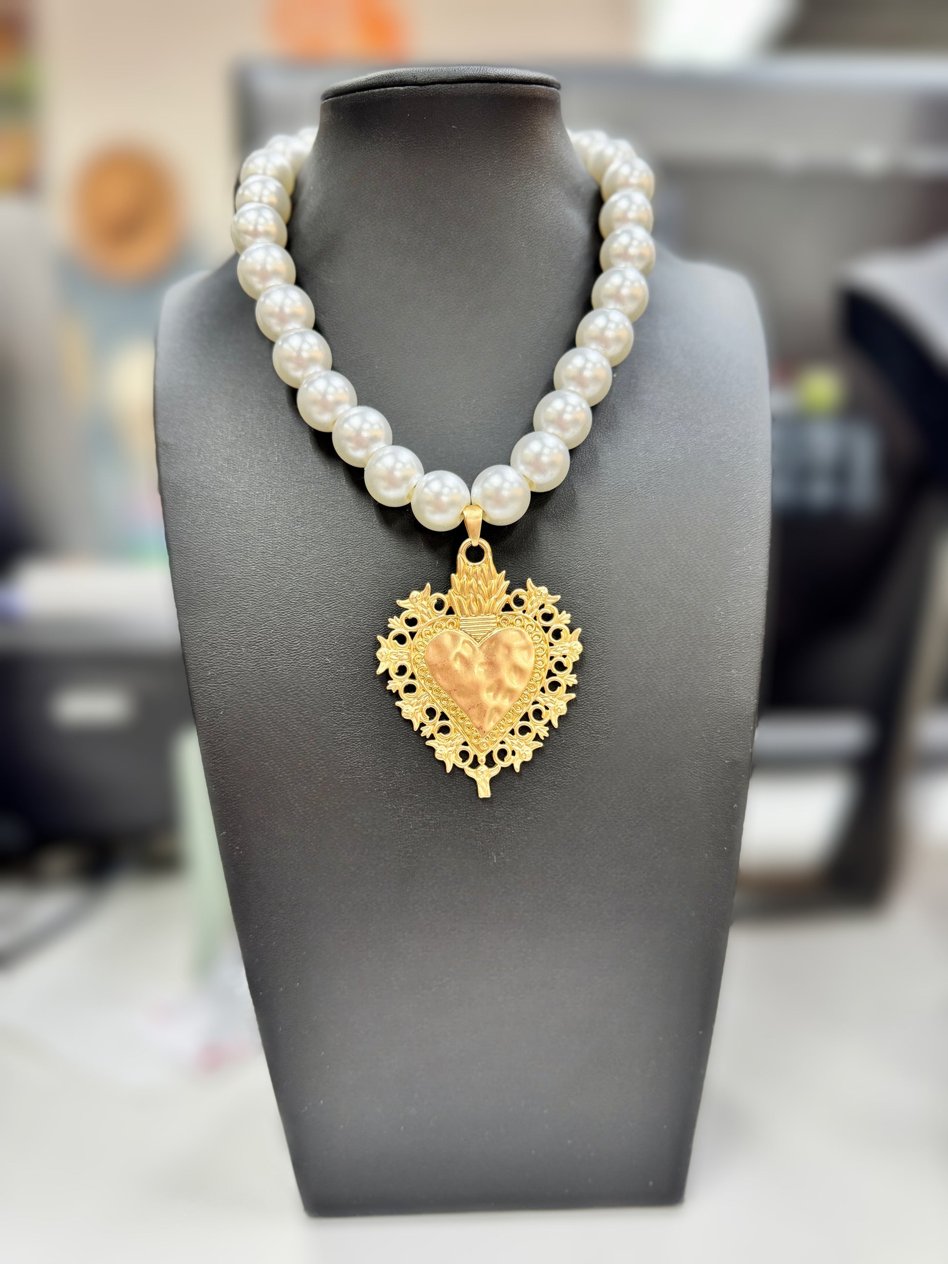 Gorgeous handmade necklace with oversized pearl beads and matte gold heart pendant.