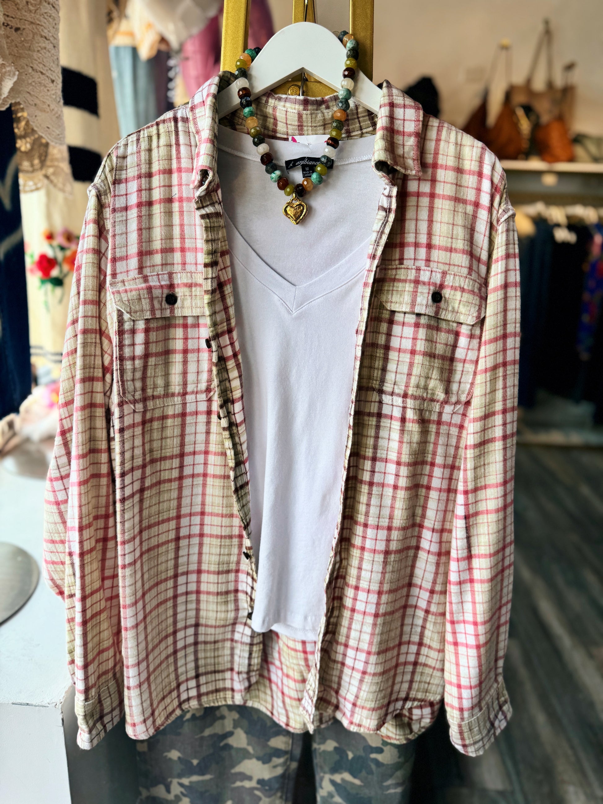 Gorgeous hand-made multi gemstone beaded necklace with antique gold heart pendant.