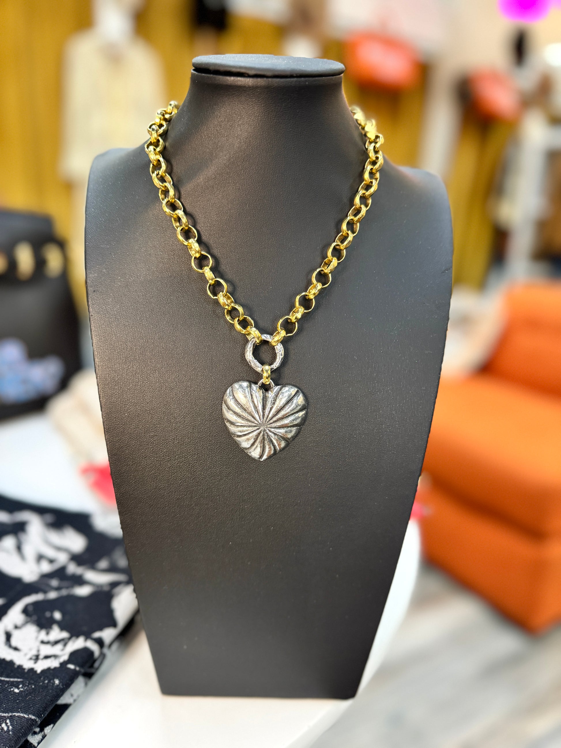 Gorgeous handmade two-tone swirly heart necklace with chunky antique gold rolo chain.